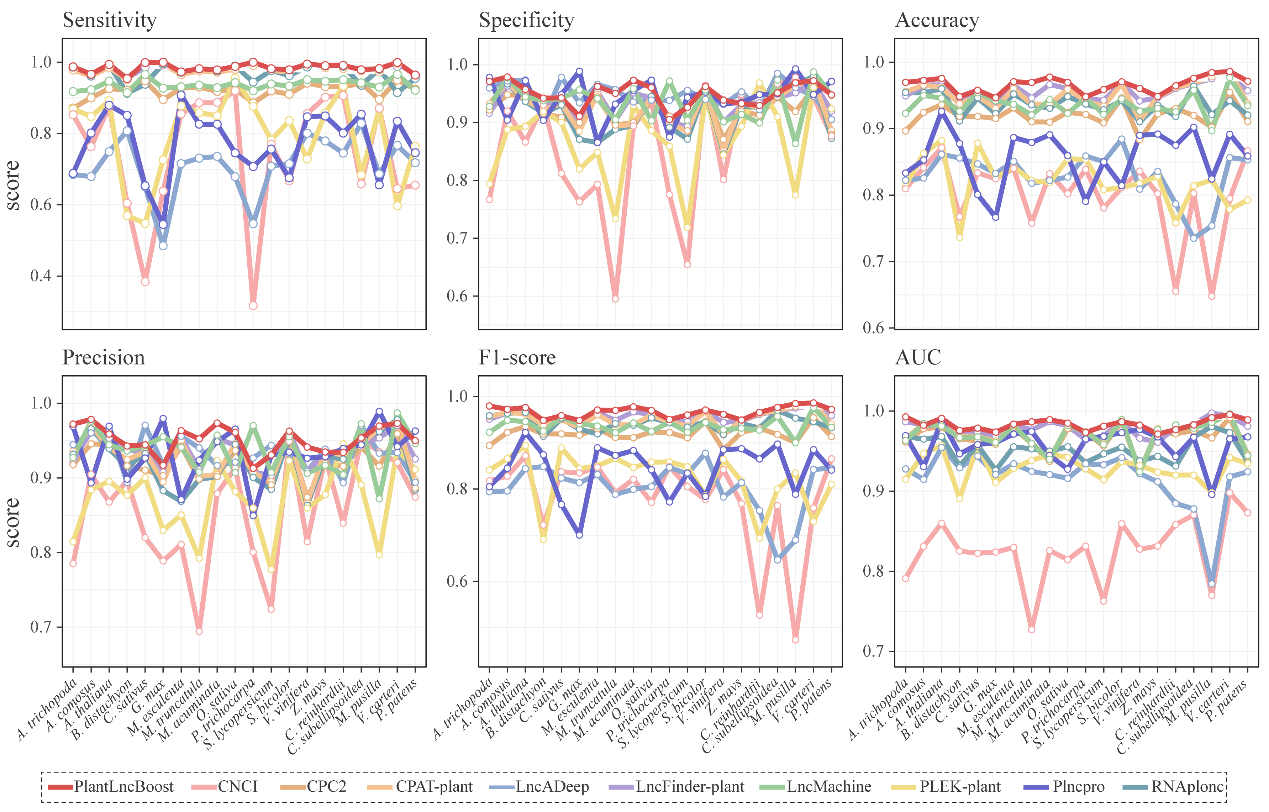 研究团队使用20个不同植物物种作为测试集,对模型进行了全面评估。测试集涵盖范围广泛,包括被子植物、苔藓植物和藻类植物等不同谱系,结果表明PlantLncBoost在所有测试物种中都保持了优异且稳定的性能(图2),证明其具有优异的跨物种泛化能力。
