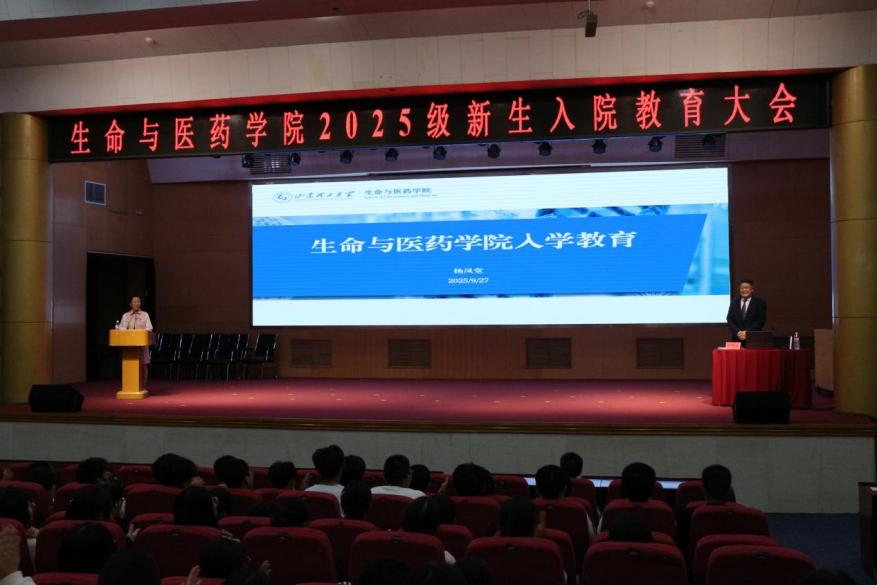 院长杨凤堂教授简要回顾了学院的发展历程,并从学科专业、师资队伍、平台建设、特色优势等方面对学院基本情况进行了介绍,并引用具体事例,梳理了近几年学院在科学研究、成果转化、服务社会、人才培养等层面取得的突出成绩,从修立德之身,铸品行端正的精神根基;养求索之志,筑格物致知的思想高地;担时代之任,赴强国兴邦的青春之约等三个方面就新生更好开启大学生活提出了希望要求。他还专门结合个人成长、求学经历,勉励全体学子要坚定知识改变命运的决心,希望并祝愿大家能以立德为基,以求索为翼,以担当为帆,在山东理工大学生命与医药学院的沃土上,书写属于自己的精彩篇章,更书写属于这个时代的生药荣光。