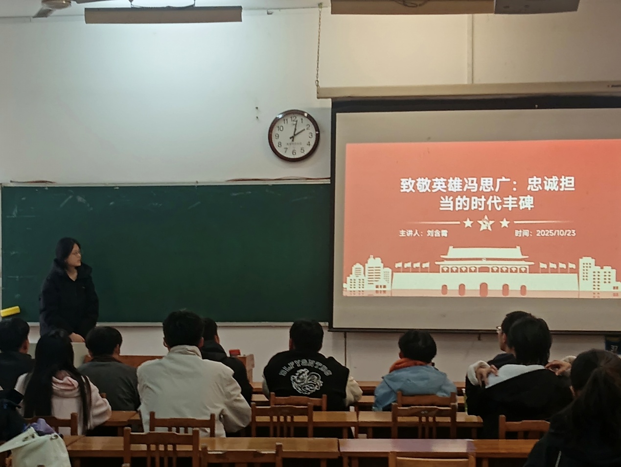 宣讲会上,主讲人刘含霄围绕冯思广的英雄事迹与精神内核展开深入分享。她详细回顾了冯思广在执行飞行任务时,为避开人口密集区域,毅然放弃最佳跳伞时机,用生命守护人民群众生命财产安全的壮烈壮举,深刻诠释了“忠诚于党、忠于人民”的崇高信仰和“舍生取义、勇于担当”的责任使命。结合同学们的实际,刘含霄特别强调,英雄精神并非仅存于危难时刻的挺身而出,更体现在日常学习工作中的坚守与奉献,鼓励同学们以冯思广为榜样,将对生命的敬畏、对责任的坚守融入各个专业领域,用专业能力守护人民,以实际行动践行初心使命。