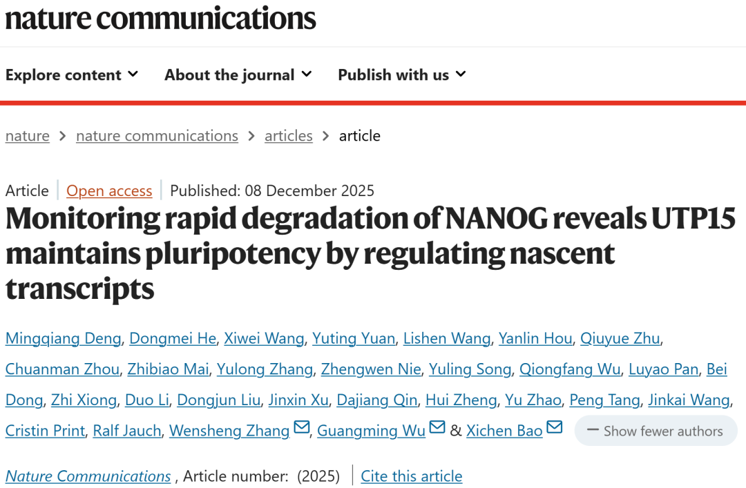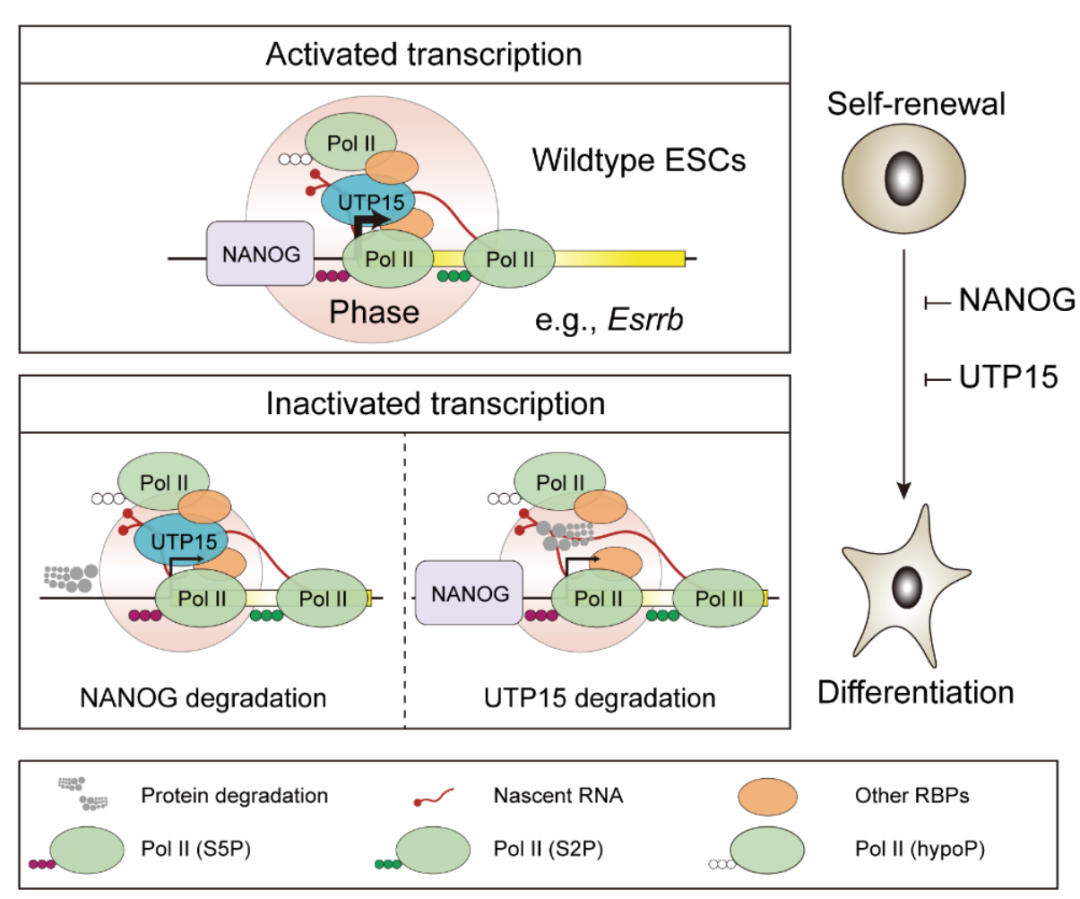 2025年12月8日,学院张文胜教授同中国科学院广州生物医药与健康研究院鲍习琛、广州国家实验室吴光明以共同通讯作者在Nature Communication 在线发表题为“Monitoring rapid degradation of NANOG reveals UTP15 maintains pluripotency by regulating nascent transcripts” 的研究论文。该研究通过应用5-乙炔基尿苷(EU)代谢标记与点击化学反应技术,系统绘制了小鼠胚胎干细胞(mESC)中NANOG蛋白快速降解条件下新生转录本及其互作RBP的动态变化图谱。该研究发现经典rRNA生物合成调控因子UTP15具有独立于rRNA生物合成的全新功能——作为多能性相关基因转录的关键激活因子。值得注意的是,NANOG调控的转录过程可增强UTP15在转录起始位点(TSS)的结合,该现象与RNA聚合酶II结合增加及更活跃的转录状态密切相关。进一步机制研究表明,UTP15能够促进RNA聚合酶II生物分子凝聚体的组装,从而可能驱动多能性基因的转录激活。本研究首次揭示了NANOG-新生转录本-UTP15这一调控轴在激活多能性基因转录中的核心作用,为研究细胞命运决定过程中主转录因子的功能提供了创新性研究范式。